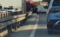 Eyüpsultan’da bariyerlere çarparak kupası ters dönen hafriyat kamyonu nedeniyle yolda uzun araç kuyrukları oluştu.